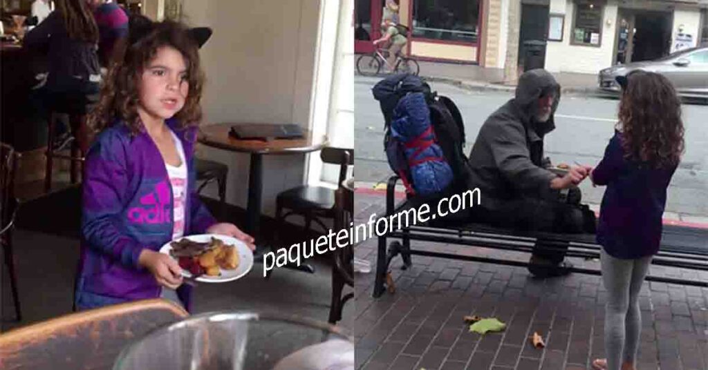 y llevárselo al señor que se encontraba sentado en las afueras del restaurante, Al padre ver el hermoso gesto de su niña decidió grabarla.