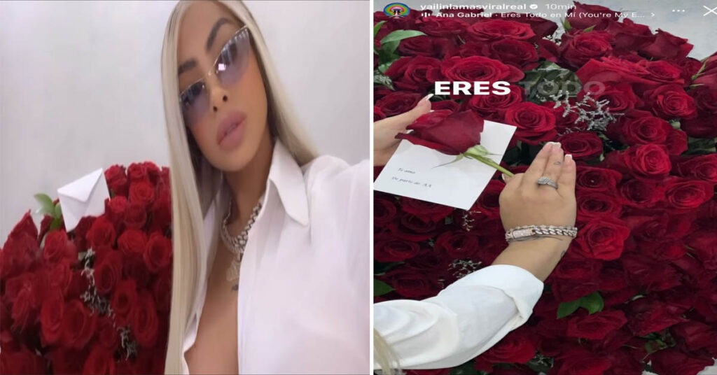 Yailin subió un video a sus historias donde se le puede ver llegar un gran arreglo florar con una carta en donde dice Te amo de parte de AA detalle que demuestra que Anuel esta profundamente enamorado de su Dominicana.