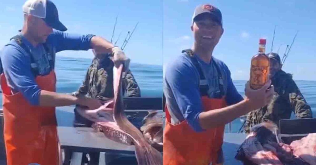 el asombro de este pescador mientras cortaba en lonja el pez al ver que al llegar al estomago del mismo se encontró nada mas y nada menos que una botella sellada de wiski fire ball,